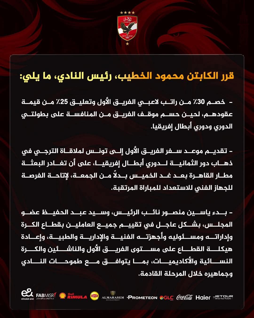 وقرر رئيس النادي خصم 30% من راتب لاعبي الفريق الأول، إلى جانب تعليق صرف 25% من قيمة عقودهم مؤقتاً، لحين حسم موقف الفريق في المنافسة على بطولتي الدوري الممتاز ودوري أبطال إفريقيا.