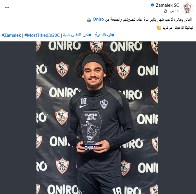 ونشر الحساب الرسمي لنادي الزمالك عبر مواقع التواصل الاجتماعي رسالة تهنئة للاعب جاء فيها : الفائز بجائزة لاعب شهر يناير بناءً على تصويتكم.. تهانينا للاعبنا أدم كايد.