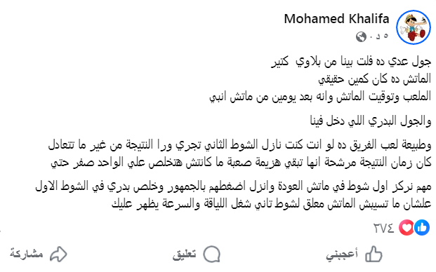 وعبر صفحته الشخصية على موقع التواصل الاجتماعى فيس بوك كتب محمد خليفة معلقاً :