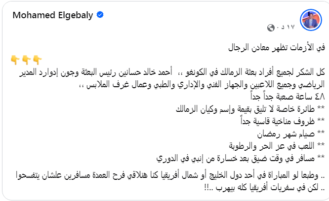كل الشكر لجميع أفراد بعثة الزمالك في الكونغو ،، أحمد خالد حسانين رئيس البعثة وجون إدوارد المدير الرياضي وجميع اللاعبين والجهاز الفني والإداري والطبي وعمال غرف الملابس ،،