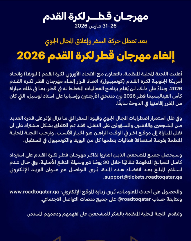 وأوضحت اللجنة المنظمة، في بيان رسمي، أنها اتخذت القرار بالتنسيق مع كل من الاتحاد الأوروبي لكرة القدم واتحاد أمريكا الجنوبية لكرة القدم، مشيرة إلى أنه لن يتم تنفيذ برنامج الفعاليات الذي كان مخططًا لإقامته في قطر.