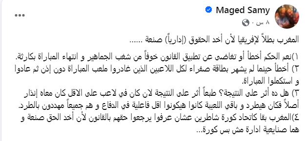 وعبر صفحته الشخصية على موقع التواصل الاجتماعى فيس بوك كتب ماجد سامى معلقاً من وجهة نظره قائلاً :