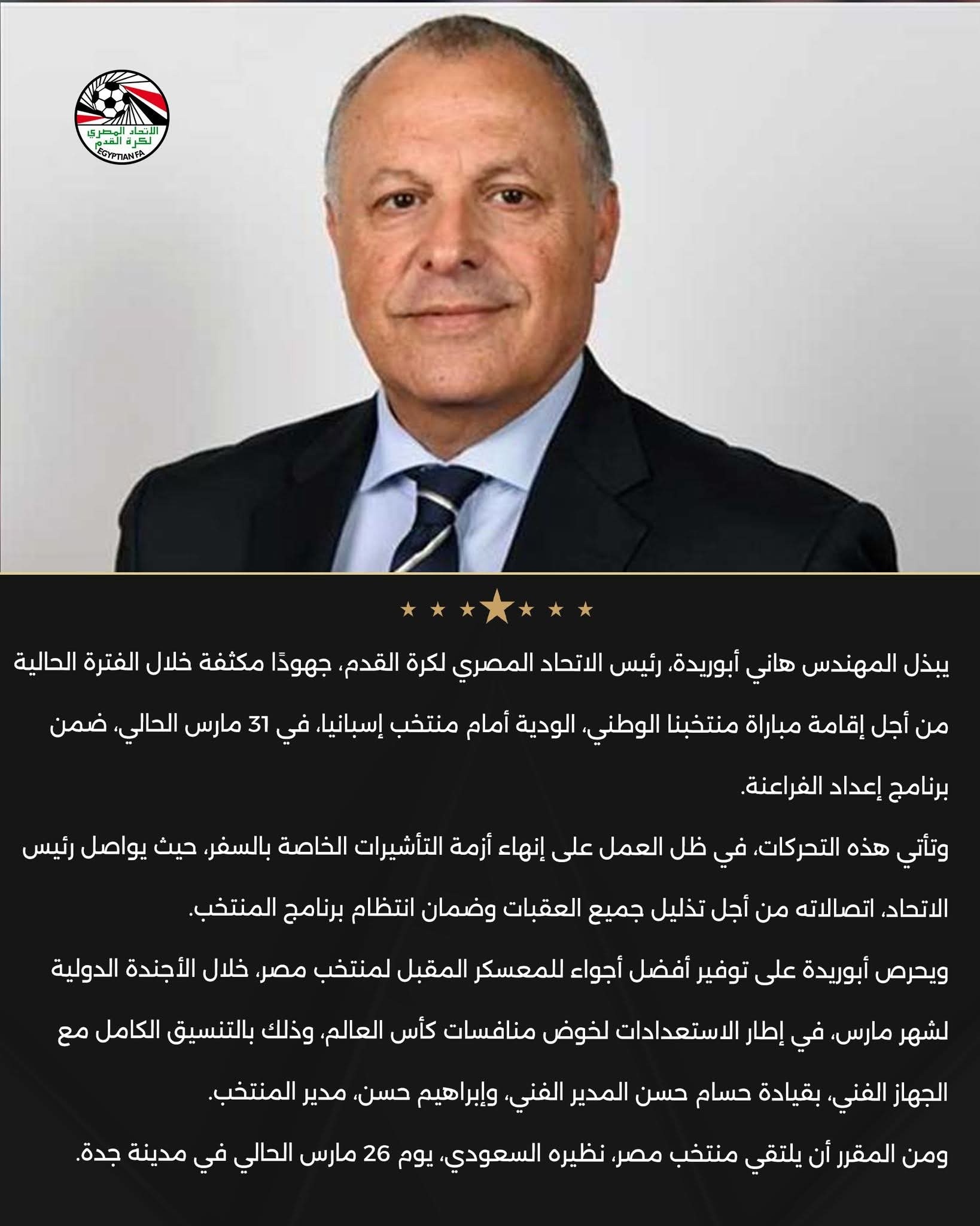 ويحرص أبو ريدة ووفق اعلان اتحاد الكرة يعنى على توفير أفضل الأجواء لمعسكر المنتخب خلال فترة التوقف الدولي في مارس، بما يضمن تحقيق أقصى استفادة فنية.