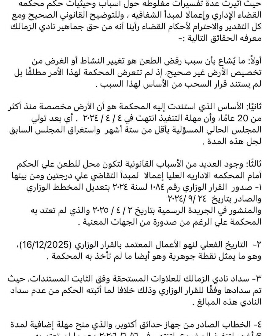 حيث أثيرت عدة تفسيرات مغلوطه حول أسباب وحيثيات حكم محكمه القضاء الإداري وإعمالا لمبدأ الشفافيه ، وللتوضيح القانوني الصحيح ومع كل التقدير والاحترام لأحكام القضاء رأينا أنه من حق جماهير نادي الزمالك معرفه الحقائق التالية :-