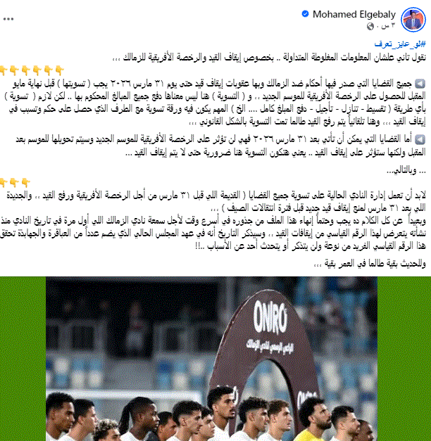 جميع القضايا التي صدر فيها أحكام ضد الزمالك وبها عقوبات إيقاف قيد حتى يوم ٣١ مارس ٢٠٢٦ يجب ( تسويتها ) قبل نهاية مايو المقبل للحصول على الرخصة الأفريقية للموسم الجديد ،، و ( التسوية ) هنا ليس معناها دفع جميع المبالغ المحكوم بها .. لكن لازم ( تسوية ) بأي طريقة ( تقسيط - تنازل - تأجيل - دفع المبلغ كامل …. الخ ) المهم يكون فيه ورقة تسوية مع الطرف الذي حصل على حكم وتسبب في إيقاف القيد ،،، وهنا تلقائياً يتم رفع القيد طالما تمت التسوية بالشكل القانوني ،،،