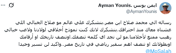 وجه أيمن يونس نجم نادي الزمالك السابق رسالة الى اللاعب الدولي المصري محمد صلاح عقب قرار رحيله عن ليفربول الانجليزي بنهاية الموسم الحالي