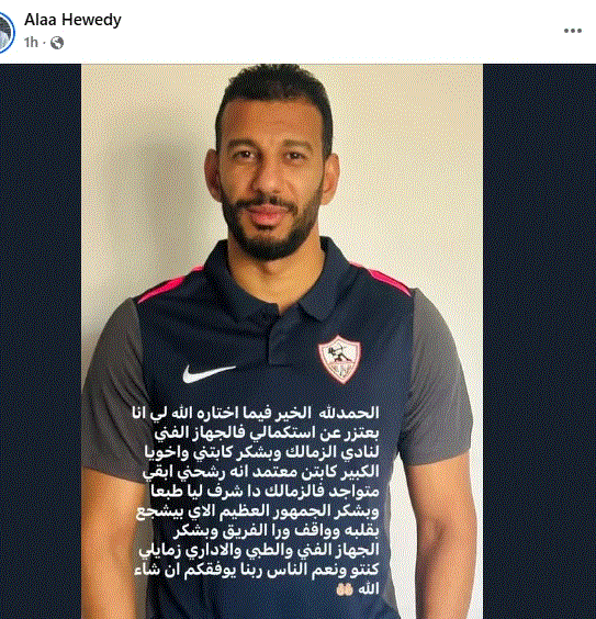 "الحمدلله الخير فيما اختاره الله لي انا بعتذر عن استكمال في الجهاز الفني في نادي الزمالك شكرا على الفترة اللي قضيتها معاكم شكرا جزيلا لكل الناس اللي كانت بتدعمني ومتمنين ان اكون قد ثقة الجميع واشكر الجمهور العظيم اللي بيشجع بقلبه وواقف ورا الفريق واشكر الجهاز الفني والطبي والاداري زمايلي وربنا يوفقكم ان شاء الله".