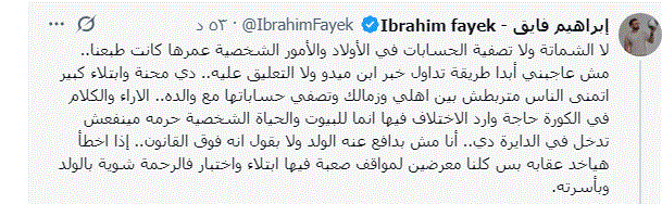 وكتب فايق من خلال حسابه على موقع التواصل الاجتماعي اكس قائلا: