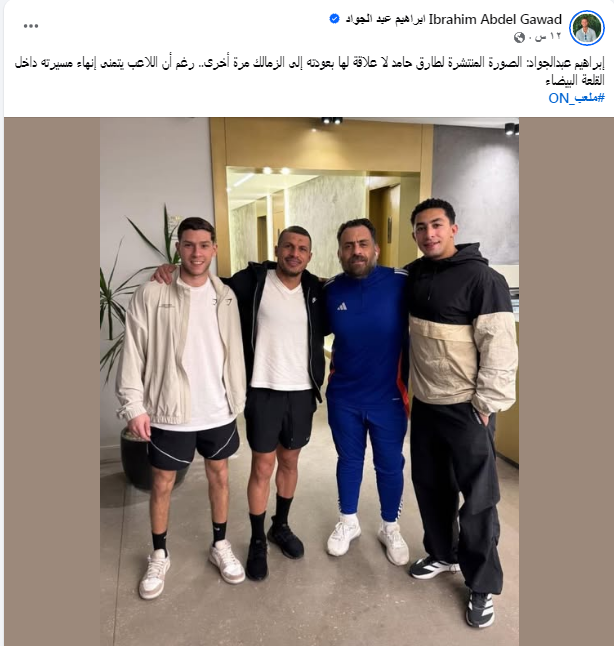 وكتب: الصورة المنتشرة لطارق حامد لا علاقة لها بعودته إلى الزمالك مرة أخرى.. رغم أن اللاعب يتمنى إنهاء مسيرته داخل القلعة البيضاء.