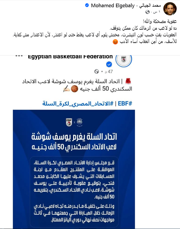 اللاعب الذى تجاوز فى حق لاعبى الزمالك بالأمس، وخرج ببيان اعتذار، خرج الاتحاد المصرى لكرة السلة بإعلان العقوبة، وهى تغريمة مبلغ 50 ألف جنيه، ولم يتم توقيع أى عقوبة إيقاف بحق اللاعب ليعلق محمد الجبالى على هذا الامر.