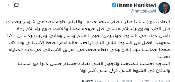 وعبر صفحته الشخصية على موقع التواصل الاجتماعى إكس كتب حسن المستكاوى معلقا :