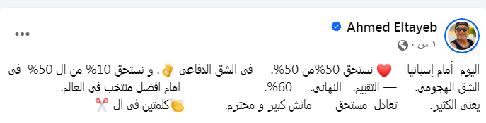 اليوم أمام إسبانيا ️نستحق 50%من 50%.. فى الشق الدفاعى. و نستحق 10% من ال 50% فى الشق الهجومى.