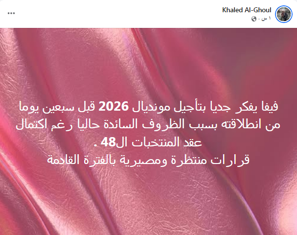فيفا يفكر جديا بتأجيل مونديال 2026 قبل سبعين يوما من انطلاقته بسبب الظروف السائدة حاليا رغم اكتمال عقد المنتخبات ال48.