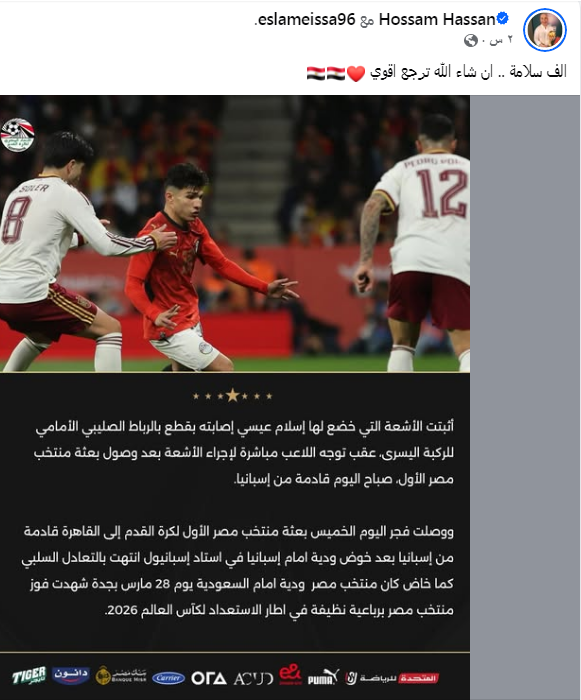 وكان إسلام عيسى قد خضع لفحوصات طبية فور عودة بعثة المنتخب إلى القاهرة قادمة من إسبانيا، وذلك للاطمئنان على حالته بعد الإصابة التي تعرض لها خلال المعسكر الأخير.