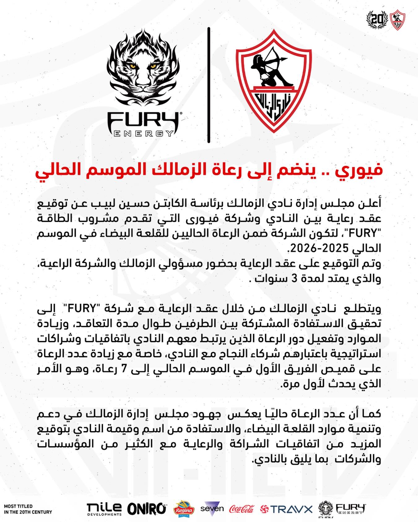 وجاء بيان نادي الزمالك الرسمي بانضمام فيوري لقائمة رعاة الزمالك من خلال عقد رعاية لمدة 3 سنوات.