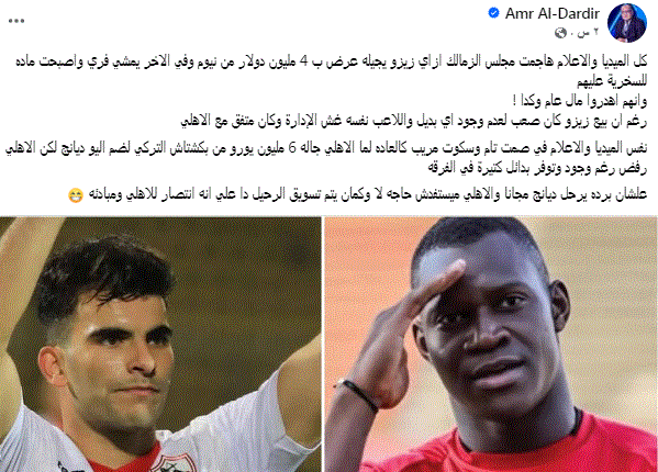قارن الكاتب الصحفي عمرو الدردير بموقف رحيل المالي أليو ديانج لاعب الأهلي عقب نهاية عقده بنهاية الموسم الحالي، وما حدث سابقا برحيل زيزو عن الزمالك بنفس الطريقة
