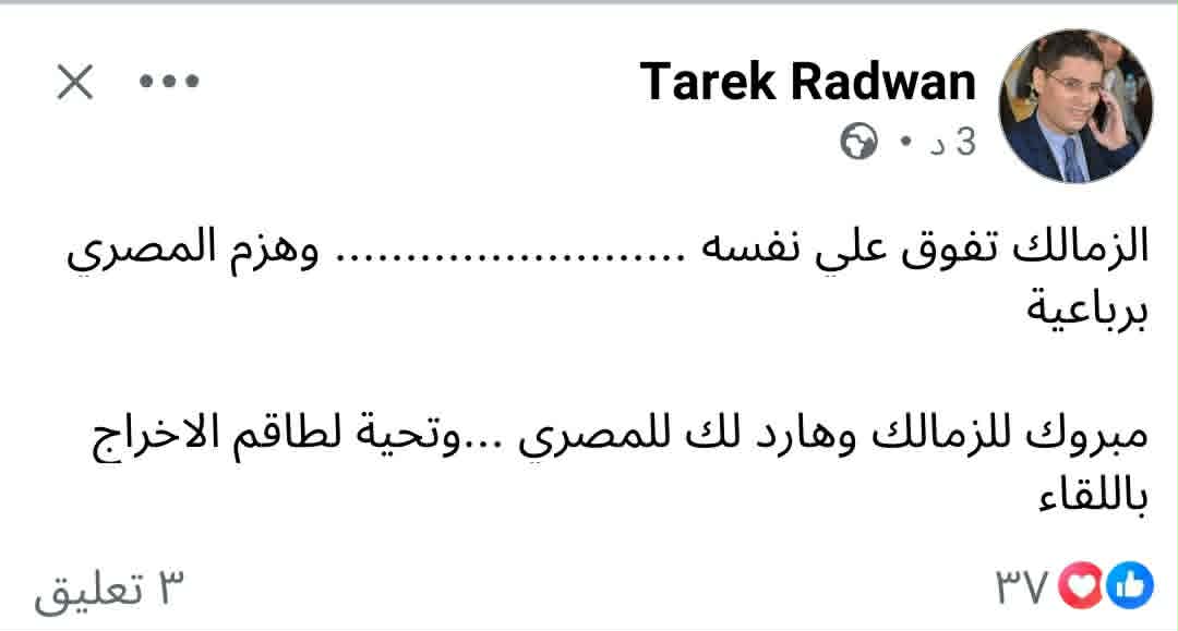 طارق رضوان وعبر صفحته الشخصية على موقع التواصل الاجتماعي فيسبوك كتب معلقاً،