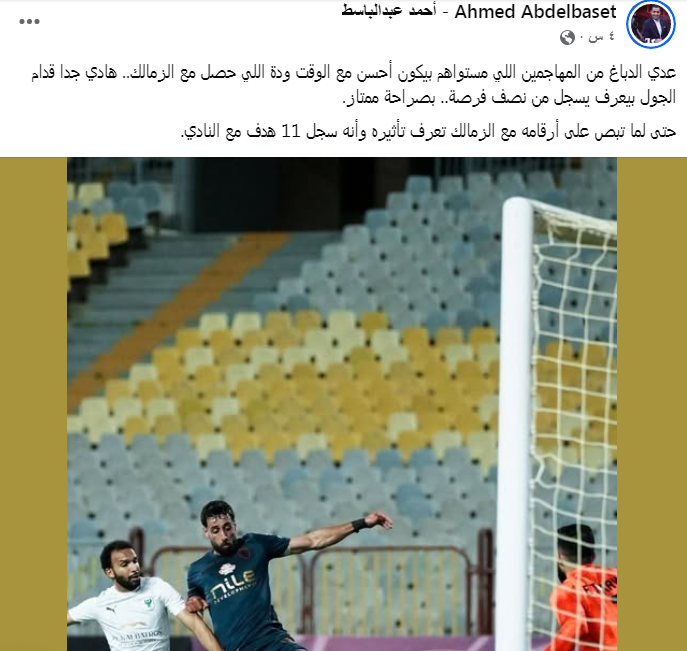 أشاد الصحفى أحمد عبد الباسط بالفلسطينى عدى الدباغ مهاجم الفريق الاول لكرة القدم بالنادى.