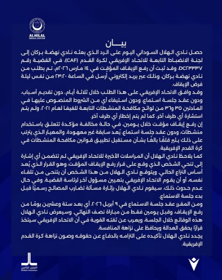 وأوضح النادي السوداني في بيانه أنه اطلع على رد نهضة بركان أمام لجنة الانضباط، والذي تضمن تفاصيل رفع الإيقاف المؤقت الصادر في 14 مارس 2026.