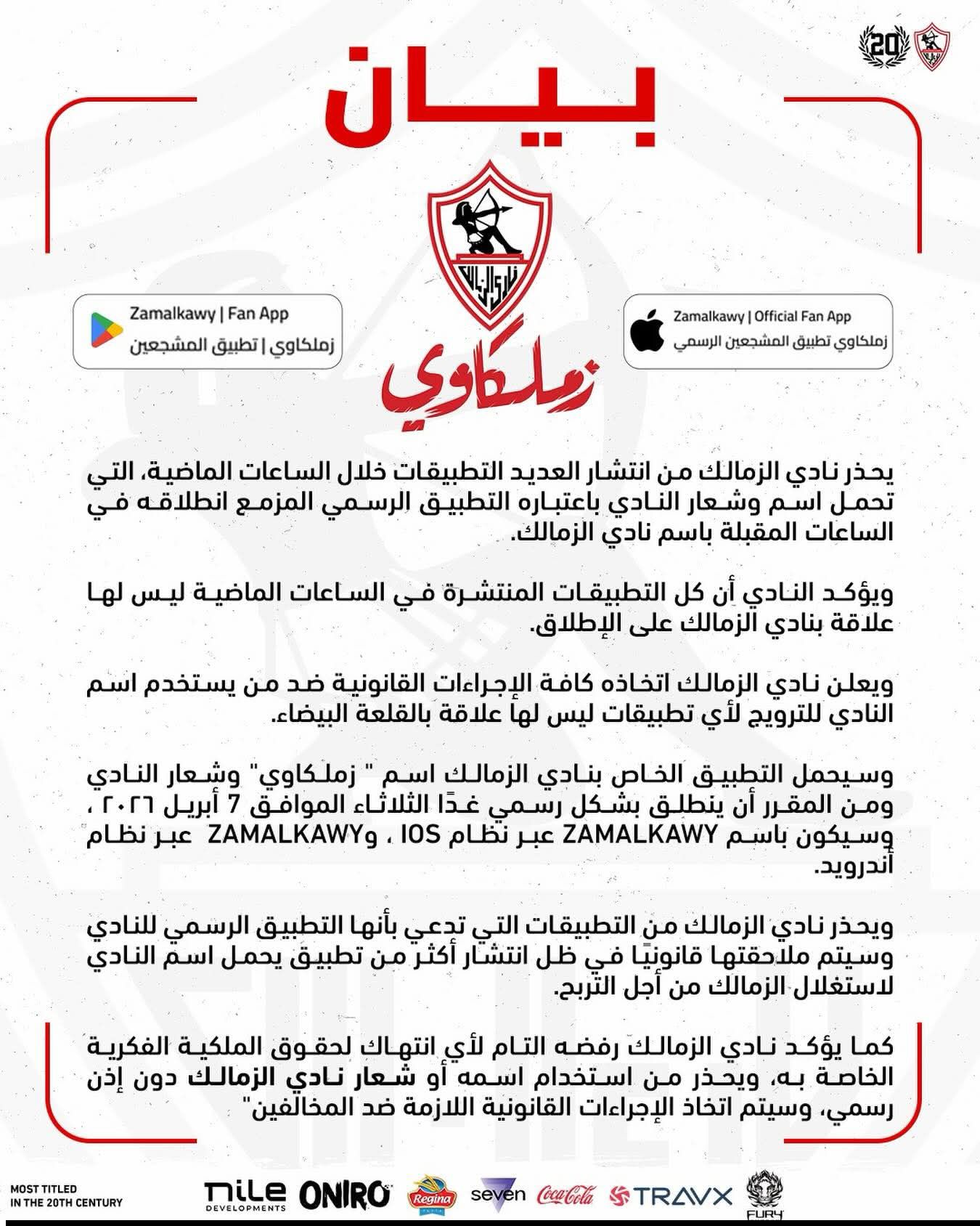 وأوضح الزمالك أنه سيتخذ كافة الإجراءات القانونية اللازمة ضد أي جهة أو شخص يستخدم اسم أو شعار النادي للترويج لتطبيقات غير رسمية، مؤكدًا تمسكه بحماية حقوقه القانونية وملكيته الفكرية.