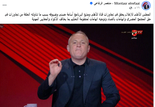 المجلس الأعلى للإعلام يحقق في تجاوزات قناة الأهلي ومذيع البرنامج أسامة حسني وضيوفه بسبب ما تناولته الحلقة من تجاوزات في حق المجتمع المصري واتهامات بالفساد وتوجيه اتهامات لمنظومة التحكيم بما يخالف الأكواد والمعايير المهنية