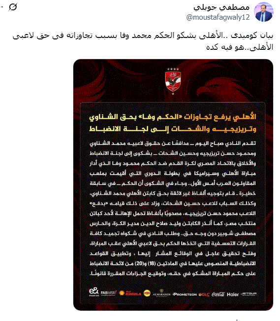 بيان كوميدى ..الأهلى يشكو الحكم محمد وفا بسبب تجاوزاته فى حق لاعبى الأهلى..هو فيه كده