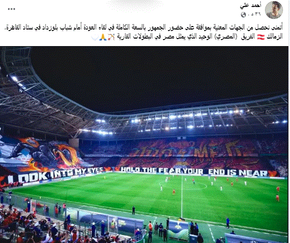 ناشد الاعلامي أحمد على المذيع السابق في قناة الزمالك الجهات الأمنية بالموافقة على حضور السعة الكاملة لاستاد القاهرة خلال مباراة شباب بلوزداد القامة.
