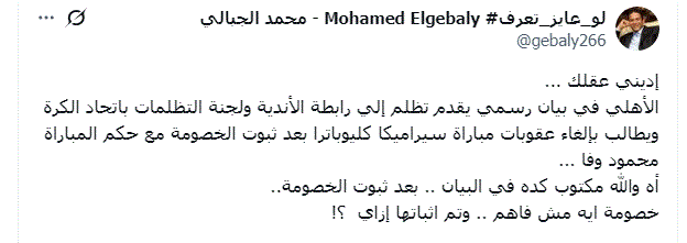 تعجب الكاتب الصحفي محمد الجبالي من بيان الأهلي اليوم الذي أعلن فيه تقدمه بتظلم إلى رابطة الأندية المحترفة ولجنة التظلمات باتحاد الكرة
