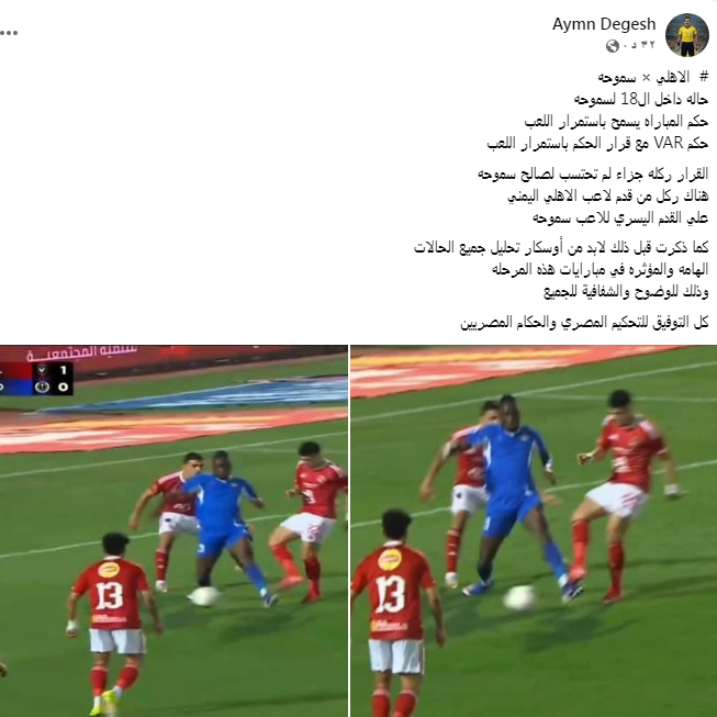 وأوضح دجيش أن سموحة كان يستحق ركلة جزاء خلال اللقاء، لوجود عرقلة واضحة من لاعب الأهلي، حيث اصطدمت قدمه اليمنى بقدم لاعب سموحة اليسرى داخل منطقة الجزاء، وهو ما يستوجب احتساب المخالفة.