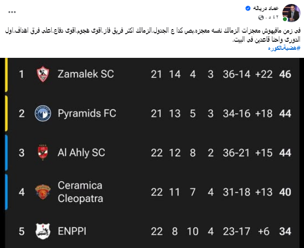 فى زمن مافيهوش معجزات الزمالك نفسه معجزه.بص كدا ع الجدول.الزمالك اكتر فريق فاز.اقوى هجوم.اقوى دفاع.اعلى فرق اهداف.اول الدورى واحنا قاعدين فى البيت.