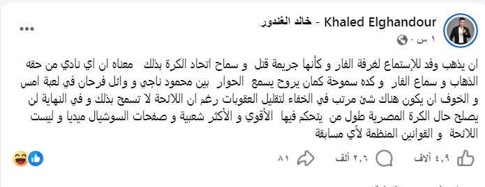 ان يذهب وفد للإستماع لغرفة الفار و كأنها جريمة قتل و سماح اتحاد الكرة بذلك معناه ان اي نادي من حقه الذهاب و سماع الفار و كده سموحة كمان يروح يسمع الحوار بين محمود ناجي و وائل فرحان في لعبة أمس.