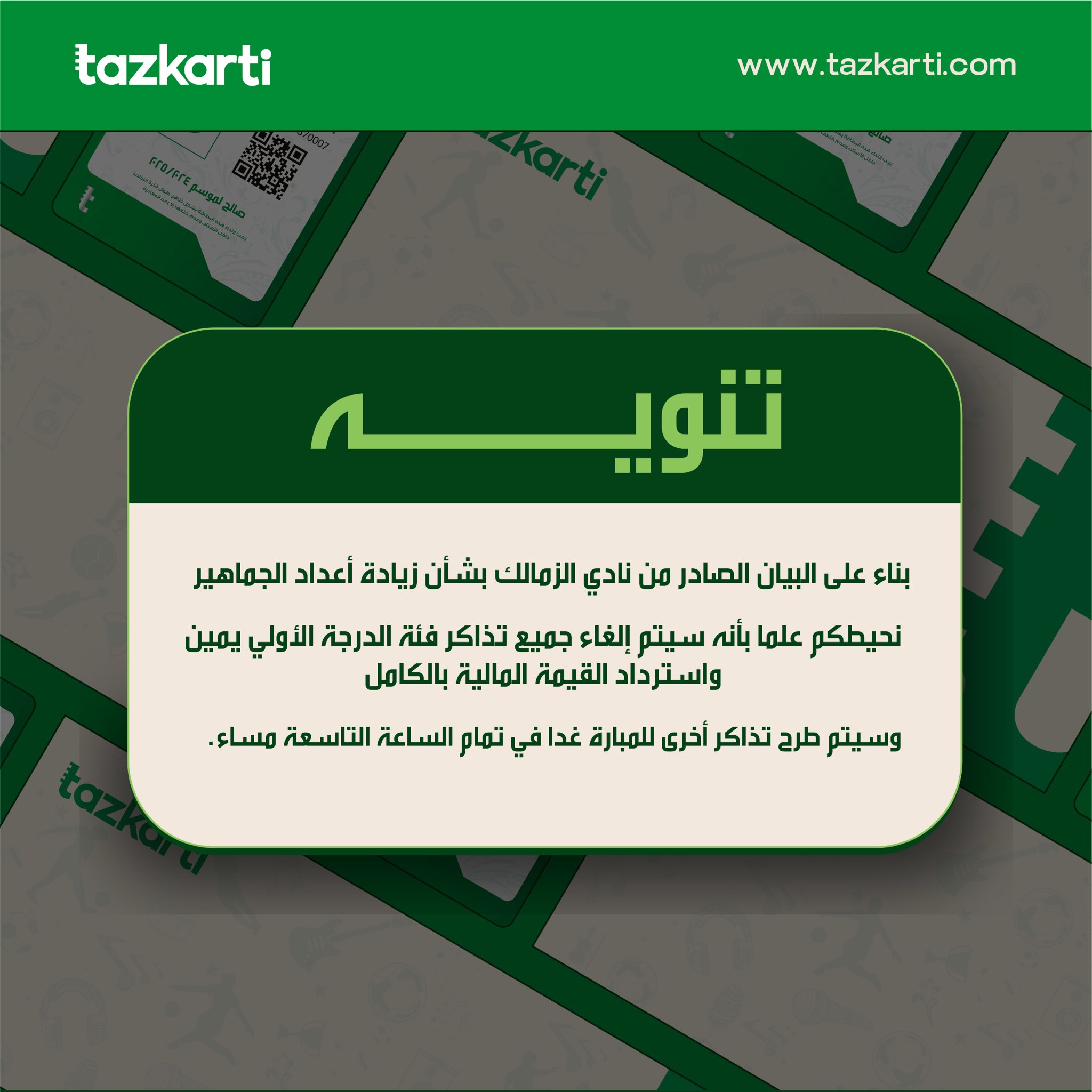 بناء على البيان الصادر من نادي الزمالك بشأن زيادة أعداد الجماهير نحيطكم علما بأنه سيتم إلغاء جميع تذاكر فئة الدرجة الأولي يمين واسترداد القيمة المالية بالكامل وطرح تذاكر أخرى للمبارة غدا في تمام الساعة التاسعة مساءً.
