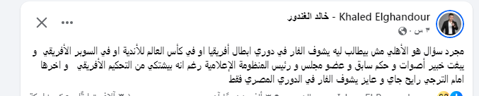 مجرد سؤال هو الأهلي مش بيطالب ليه يشوف الفار في دوري ابطال أفريقيا او في كأس العالم للأندية او في السوبر الأفريقي و يبغت خبير أصوات و حكم سابق و عضو مجلس و رئيس المنظومة الإعلامية رغم انه بيشتكي من التحكيم الأفريقي و اخرها امام الترجي رايح جاي و عايز يشوف الفار في الدوري المصري فقط
