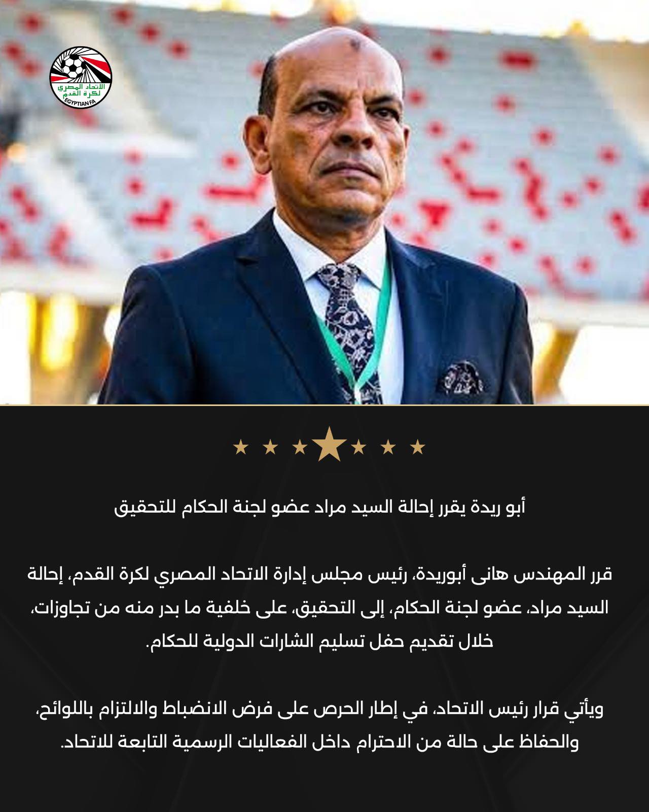 وعلى هذا قرر رئيس الاتحاد هاني أبو ريدة إحالة السيد مراد، عضو لجنة الحكام، إلى التحقيق، على خلفية ما بدر منه خلال فعاليات الحفل الرسمي لتسليم الشارات الدولية.