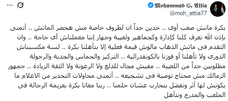 بكرة ماتش صعب أوى .. حدين جداً ان لظروف خاصة مش هحضر الماتش .. أتمنى بإذن الله نعرف كلنا كإدارة وكجماهير ولعيبة وجهاز إننا معملناش أى حاجة .. وان التقدم فى ماتش الذهاب مالوش قيمة فعلية إلا بتأهلنا بكرة ..