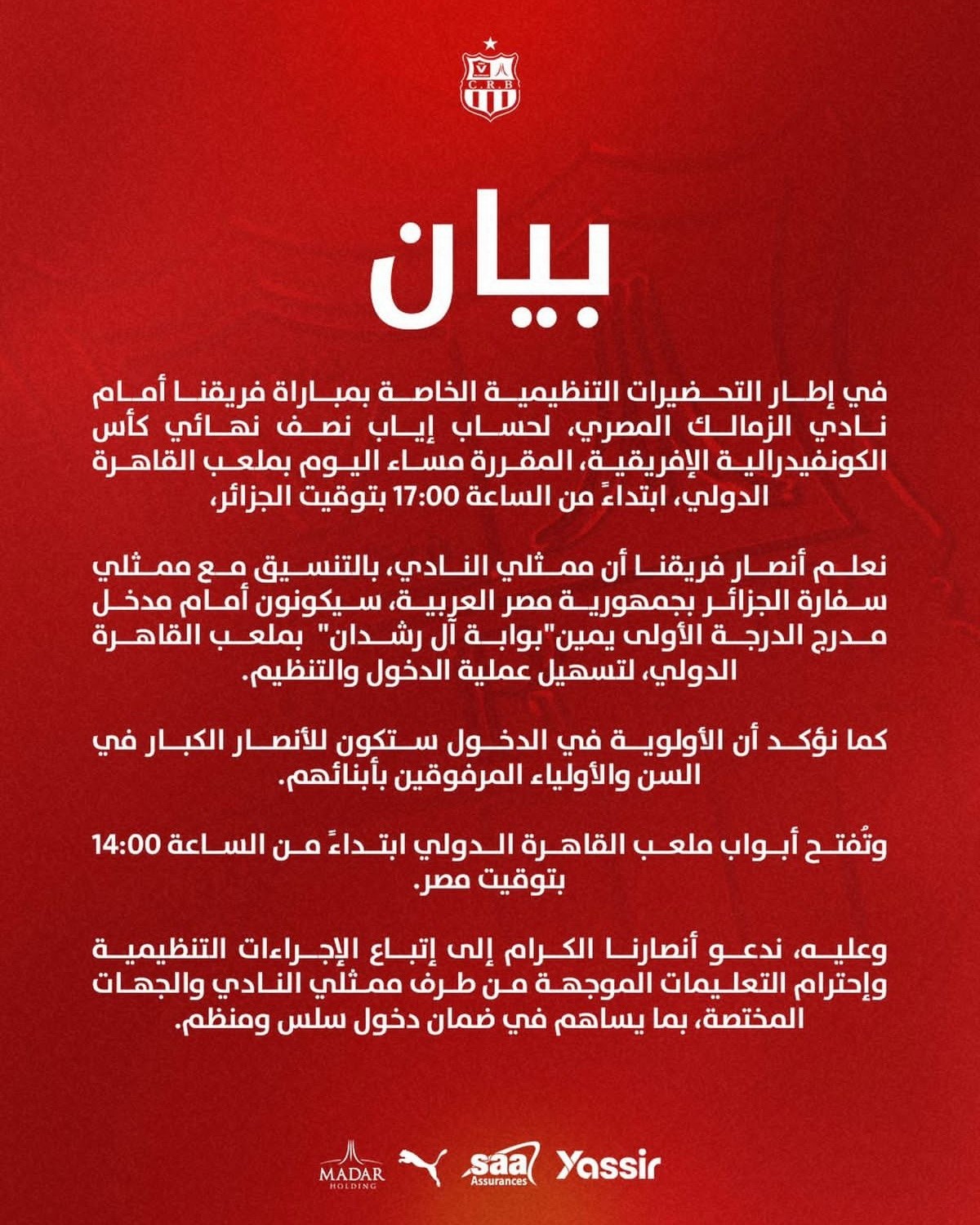 وأوضح النادي أن المباراة تنطلق في تمام الساعة 17:00 بتوقيت الجزائر، وأنه تم التنسيق مع ممثلي النادي بالتعاون مع السفارة الجزائرية في مصر، لتسهيل دخول الجماهير إلى الملعب.