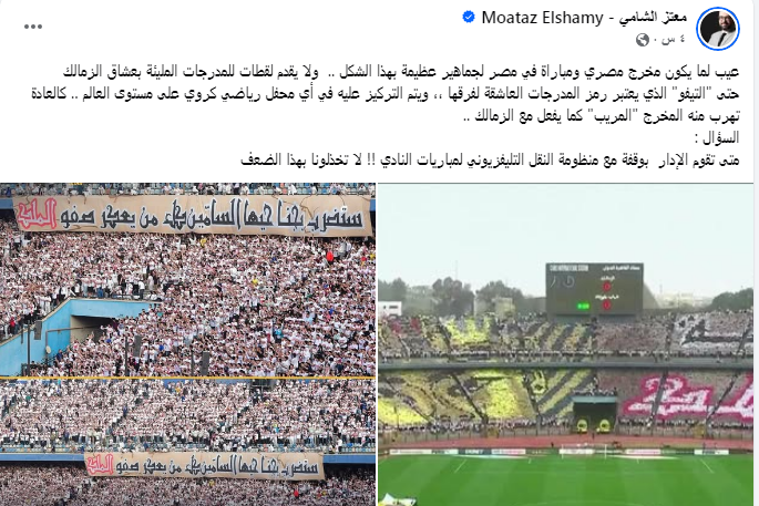 عيب لما يكون مخرج مصري ومباراة في مصر لجماهير عظيمة بهذا الشكل .. ولا يقدم لقطات للمدرجات المليئة بعشاق الزمالك