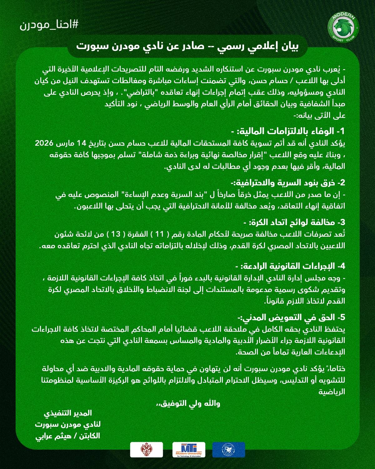 5- الحق في التعويض المدنييحتفظ النادي بحقه الكامل في ملاحقة اللاعب قضائيا أمام المحاكم المختصة لاتخاذ كافة الاجراءات القانونية اللازمة جراء الأضرار الأدبية والمادية والمساس بسمعة النادي التي نتجت عن هذه الإدعاءات العارية تماماً من الصحة.ختامًا، يؤكد نادي مودرن سبورت أنه لن يتهاون في حماية حقوقه المادية والادبية ضد أي محاولة للتشويه أو التدليس، وسيظل الاحترام المتبادل والالتزام باللوائح هو الركيزة الأساسية لمنظومتنا الرياضية.