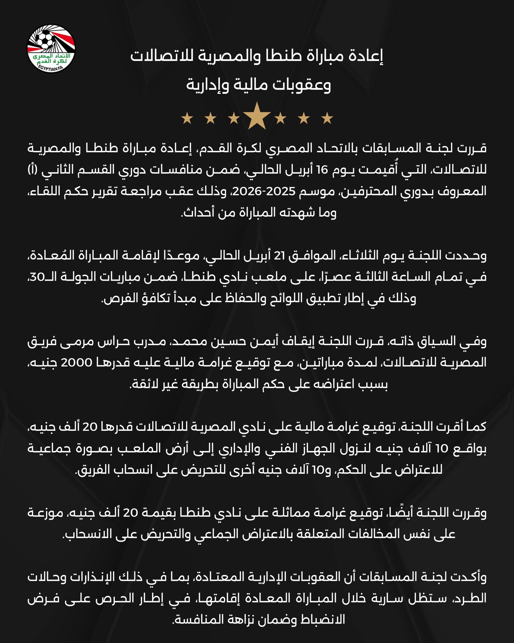 كما أقرت اللجنة، توقيع غرامة مالية على نادي المصرية للاتصالات قدرها 20 ألف جنيه، بواقع 10 آلاف جنيه لنزول الجهاز الفني والإداري إلى أرض الملعب بصورة جماعية للاعتراض على الحكم، و10 آلاف جنيه أخرى للتحريض على انسحاب الفريق.