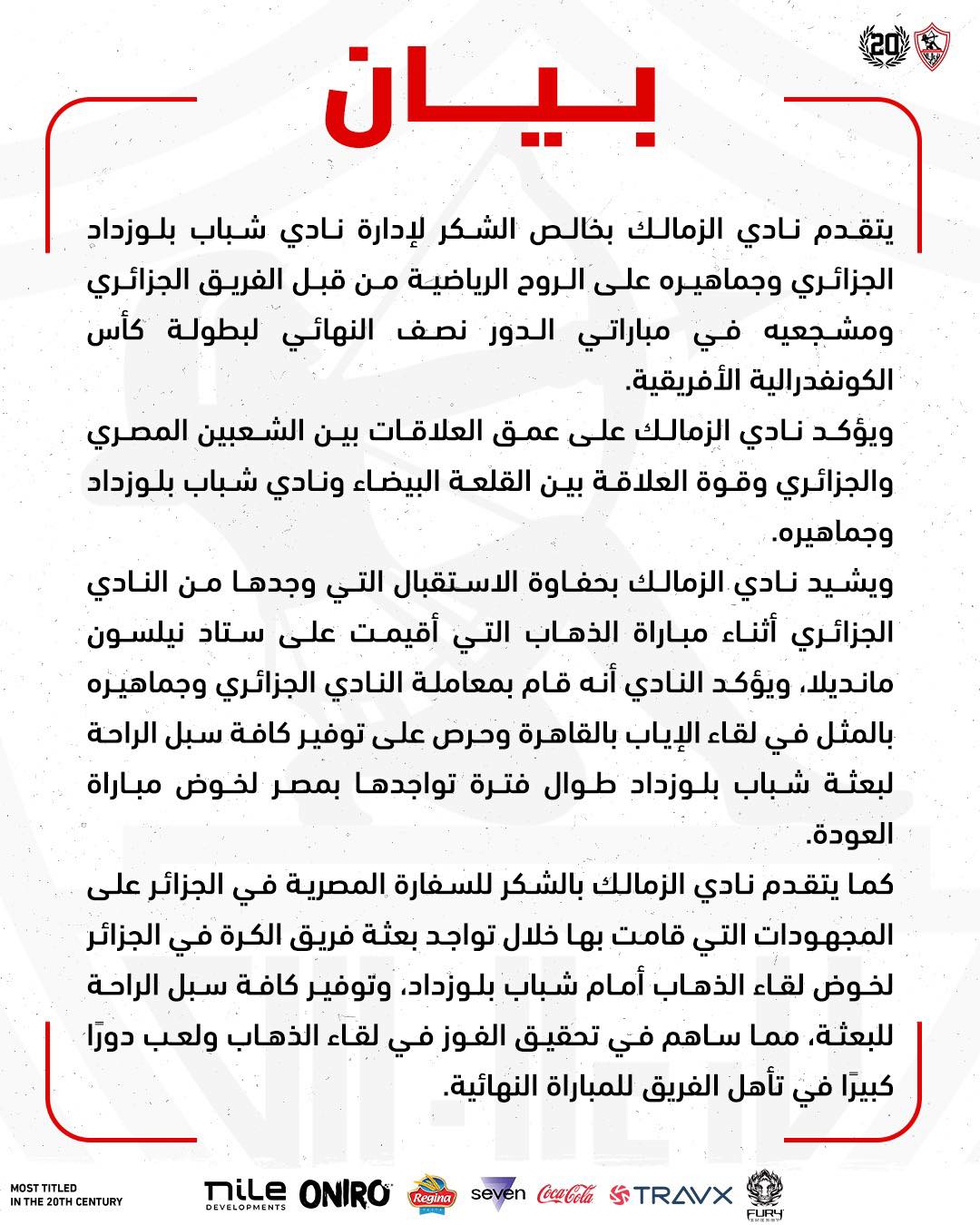وجه نادي الزمالك رسالة شكر وتقدير إلى نادي شباب بلوزداد الجزائري، إدارةً وجماهير، على الأجواء الرياضية المميزة التي سادت مواجهتي نصف نهائي بطولة كأس الكونفدرالية الإفريقية بين الفريقين.
