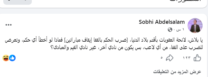 يا بلاش، لائحة العقوبات بأقدم بلاد الدنيا، [ضرب الحكم بالقفا إيقاف مباراتين] فماذا لو أخطأ أي حكم، وتعرض للضرب على القفا، من أي لاعب، بس يكون من نادي آخر، غير نادي القيم والمبادى؟