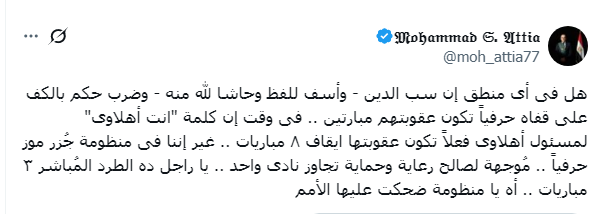 هل فى أى منطق إن سب الدين - وأسف للفظ وحاشا لله منه - وضرب حكم بالكف على قفاه حرفياً تكون عقوبتهم مبارتين .. فى وقت إن كلمة "انت أهلاوى" لمسئول أهلاوى فعلاً تكون عقوبتها ايقاف ٨ مباريات ..