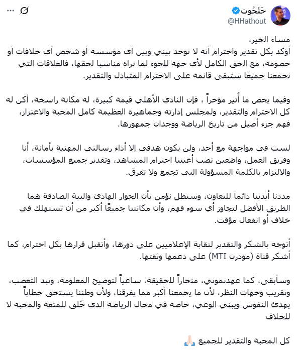 وفيما يخص ما أُثير مؤخراً ، فإن النادي الأهلي قيمة كبيرة، له مكانة راسخة، أكن له كل الاحترام والتقدير، ولمجلس إدارته وجماهيره العظيمة كامل المحبة والاعتزاز، فهم جزء أصيل من تاريخ الرياضة ووجدان جمهورها.