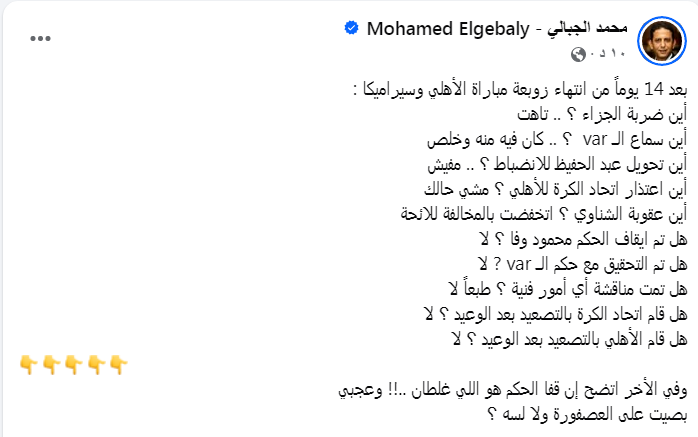 وعبر صفحته الشخصية على موقع التواصل الاجتماعى فيس بوك كتب محمد الجبالى قائلاً معلقاً متسائلاً :
