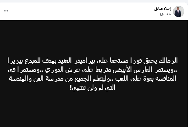 وعبر صفحته الشخصية على موقع التواصل الاجتماعى فيس بوك كتب اسلام صادق معلقاً :