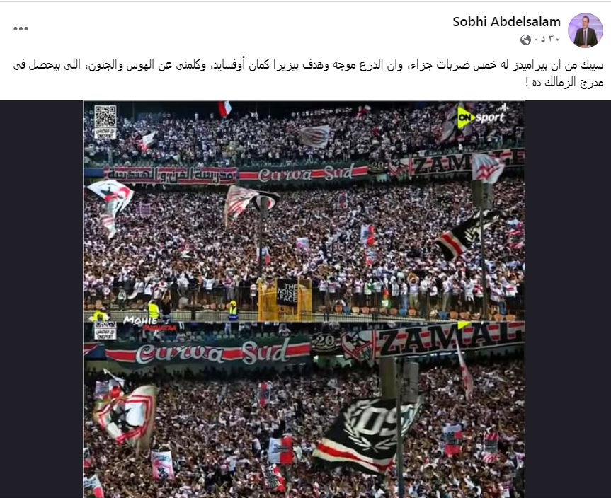 سيبك من ان بيراميدز له خمس ضربات جزاء، وان الدرع موجه وهدف بيزيرا كمان أوفسايد، وكلمني عن الهوس والجنون، اللي بيحصل في مدرج الزمالك ده !
