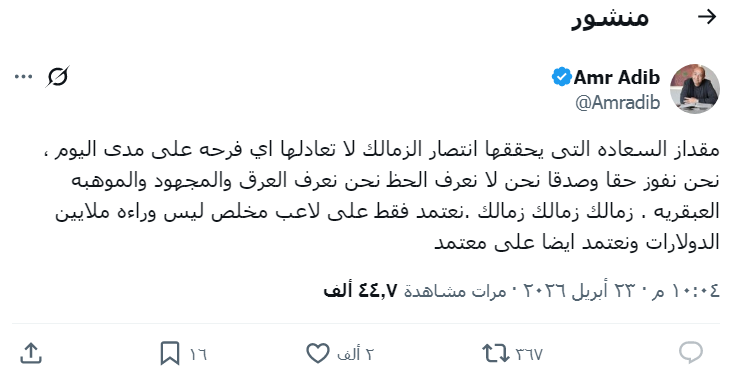 وعبر صفحته الشخصية على موقع التواصل الاجتماعى إكس كتب عمرو أديب معلقاً :