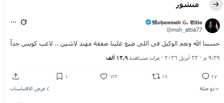 وعبر صفحته الشخصية على موقع التواصل الاجتماعى إكس كتب المستشار محمد عطية قائلاً :