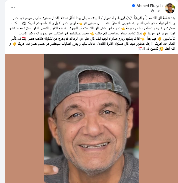 وتابع: كذلك مستوى و خبرة و عقليّة و ذكاء و فورمة 👈عمر جابر كابتن الزمالك متصدّر الدورى تجعله الظهير الأيمن الاقرب مع / محمد هانى لهذا المركز فى امريكا 👌كذلك تواجد حسام عبدالمجيد الى جانب محمد عبدالمنعم فى المنتخب امر ضرورى و هما الأقرب كأساسيين