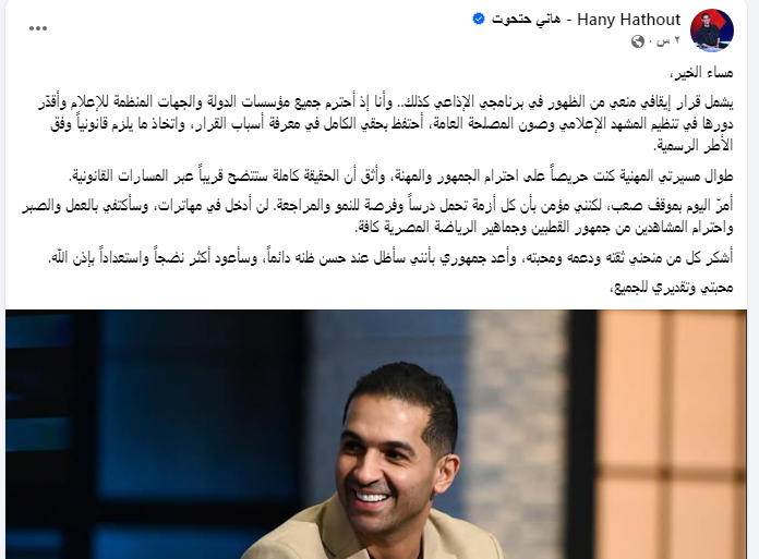 يشمل قرار إيقافي منعي من الظهور في برنامجي الإذاعي كذلك.. وأنا إذ أحترم جميع مؤسسات الدولة والجهات المنظمة للإعلام وأقدّر دورها في تنظيم المشهد الإعلامي وصون المصلحة العامة، أحتفظ بحقي الكامل في معرفة أسباب القرار، واتخاذ ما يلزم قانونياً وفق الأطر الرسمية.